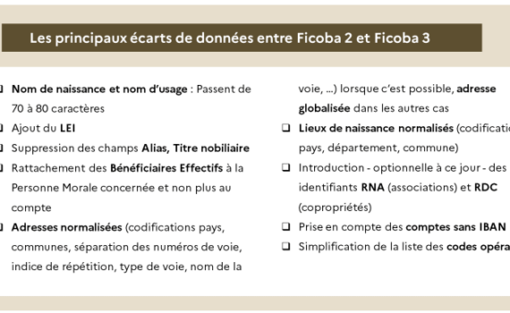 Voir le site de la DGFIP FICOBA3, la refonte du Fichier des Comptes Bancaires et Assimilés, concerne tous les établissements […] La norme FICOBA3 entre en vigueur10 septembre 2024 dans Actualités APTORIEL / Actualités réglementaires par mlp